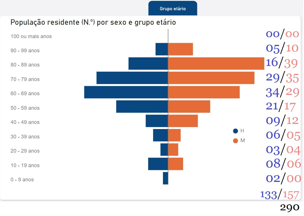 Com menos de 20 anos tinha 16 habitantes: dez rapazes e seis raparigas. Com 100 ou mais anos não havia ninguém. Com 60 anos ou mais (até 99 anos) tinha 197 habitantes: 113 Mulheres e 84 Homens. Entre os 20 ou mais anos e menos de 60 anos tinha 77 habitantes: 39 Homens e 38 Mulheres. Assim, 16 + 77 + 197 = 290. Em percentagens: 5 por cento (menos de 20 anos), 27 por cento (entre 20 e 59 anos) e 68 por cento (com 60 anos ou mais, mas menos de 100). Em cada dez habitantes, sete tem mais de 60 anos!